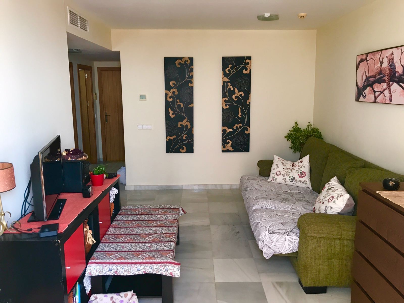 Dispone de terraza, lavadora, plancha, acceso internet (wifi), calefacción bomba de calor, aire acondicionado, piscina comunitaria, garaje en mismo edificio, 1 Televisor.