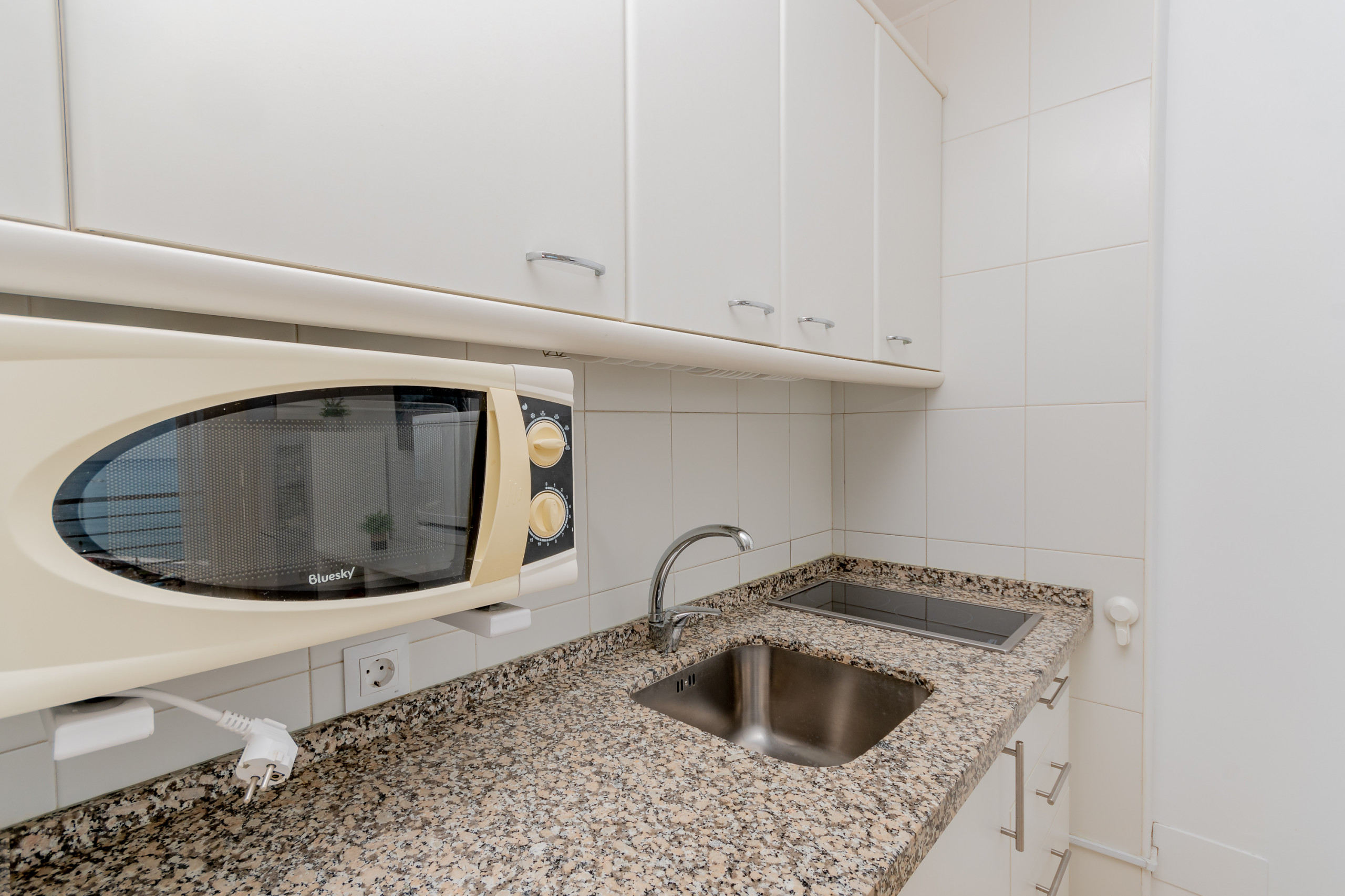 El apartamento dispone de una terraza amueblada con vistas al mar, donde podrás desayunar disfrutando del paisaje. La habitación cuenta con una cómoda cama de matrimonio, y el salón incluye aire acondicionado para mantener el ambiente perfecto. La cocina americana está totalmente equipada con vitrocerámica, nevera, microondas, lavadora, congelador, cafetera, tostadora y todo lo necesario para preparar tus comidas. El baño es amplio, funcional y cuenta con plato ducha.